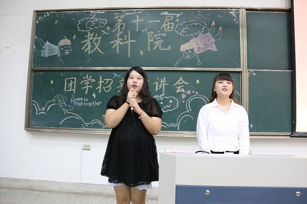 激情四溢的开场舞点燃了整个会场的气氛,在座的同学们跟着音乐打起了节拍。开场舞后,教科院团委副书记吴倩同学与学生会主席谷虹同学分别对参会同学介绍了本届团学的部门职责与分工以及其各部门的人员构成。接着,学院第九届学生会主席陈娇与第十届学生会主席许美琴分享了他们在学生会的学习与收获,希望学弟学妹们能够加入团学这个大家庭,不断地提升自己各方面的能力,实现自己的梦想。接下来是团委各部门公寓团工委、实践部、组织部、宣传部、社联部部长依次对所在部门的介绍并提出招新要求。学生会各部门介绍前播放了中场视频,视频由学生会成员制作,内容温馨励志,以别样的方式传递了团学精神。学生会各部门随后进行了介绍,分别是办公室、学习科研部、生活维权部、文艺部、体育部、培训部。各部门介绍方式不同,有炫酷路线,温馨路线和欢乐路线等,但都体现出团学成员对新生加入团学的热切期望。