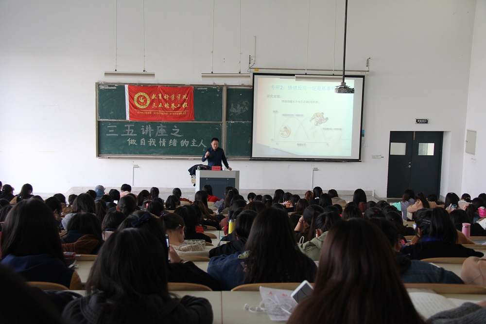 11月15日13:30,严弈峰老师在9号楼201给教科院学生作题为“自我情绪的主人”的三五讲座,近300名学生到场聆听本场讲座