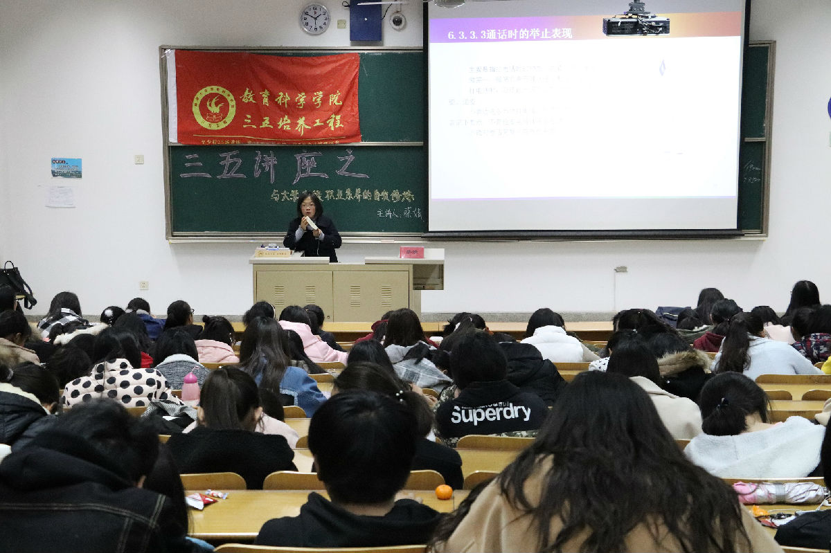 11月29日下午,蔡婧老师在4号楼205做题为“与大学生谈职业素养的自我修养”的三五讲座,本次三五讲座也是我院12.5心理健康宣传月的心理讲座的第一讲,全院200余人到场参与。