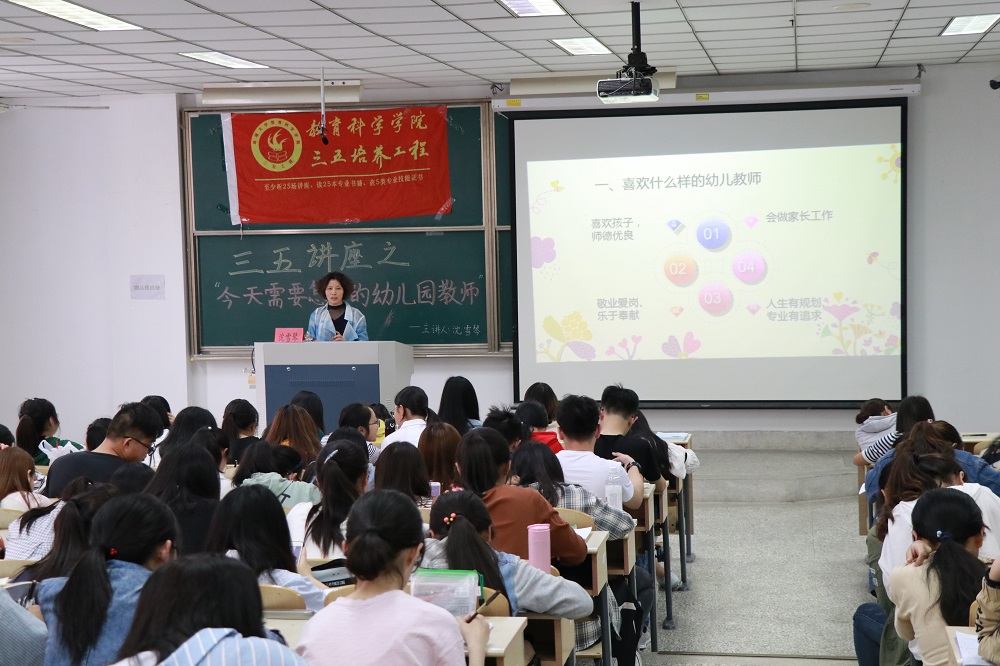 5月2日14:00,6776永利集团于8号教学楼203教室成功举办了以“今天需要怎样的幼儿园教师”为主题的三五讲座。本次讲座由幼儿园园长沈雪琴老师主讲,教科院180余名学生到场参与此次讲座。