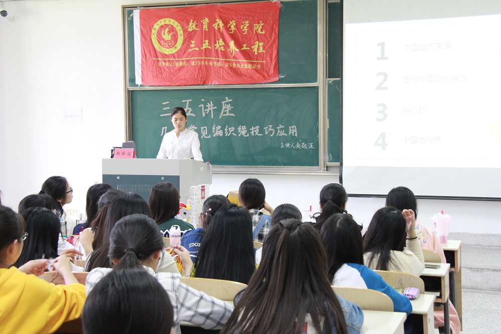 5月9日14:00,6776永利集团于8号教学楼102教室成功举办了三五讲座之“几种常用的编织绳技巧”。本次讲座由民间艺人赵敬波老师主讲,教科院100余名学生到场参与此次讲座。