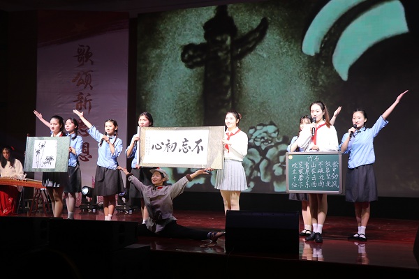 教科院代表队带来的《四十年的床》,以新颖的艺术构想和独特的艺术形式展示了属于教科院的风采。顾佳言、陆佳婷和杨紫珏以声情并茂的朗诵开场,中国四十年前的景象犹在眼前,正是中国共产党带领中国人民走向了一条可持续发展之路。随后,于欣苗、张银莹、闫梦梦、江玥和陈莞霓陆续上场,一起回望了四十年改革所带来的变化,并展望中国美好的未来。与此同时,陆佳婷现场完成的国画和杨紫珏书写的粉笔字《竹石》也展现在大家眼前。竹子弯而不折,折而不断,正是一代又一代中国人民的坚韧意志。那粉笔字娟秀的字迹下,蕴含的是教科院师范生们扎实的基本功。顾佳言一幅苍劲有力的毛笔字“不忘初心”为本次表演画上了圆满的句号。不忘初心,砥砺前行,伟大复兴中国梦的交响,弹奏出祖国繁荣富强的序曲,这就是亿万华夏儿女扬帆远航的旗帜!