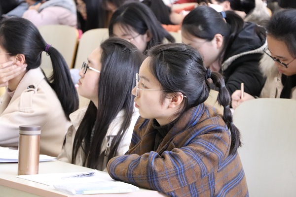 陶老师以我国儒学的代表人物孔子生平事迹为切入口,简要阐述了孔子的生平和他的儒学思想。然后根据时间轴度,将不同时期的儒学代表人物的思想进行了对比。接着,陶老师对于儒学的核心思想提出了自己见解,她将教育二字拆开进行解读,生动风趣,并且教导同学们需要理解“百善孝为先”的儒学思想。在讲座的最后,她将儒家文化与当代的社会主义核心价值观相结合,帮助学生们更好地理解儒家文化在当代社会的意思。