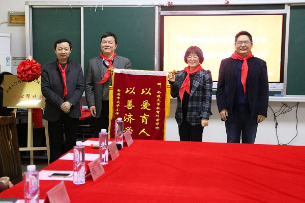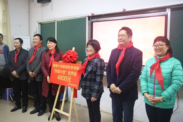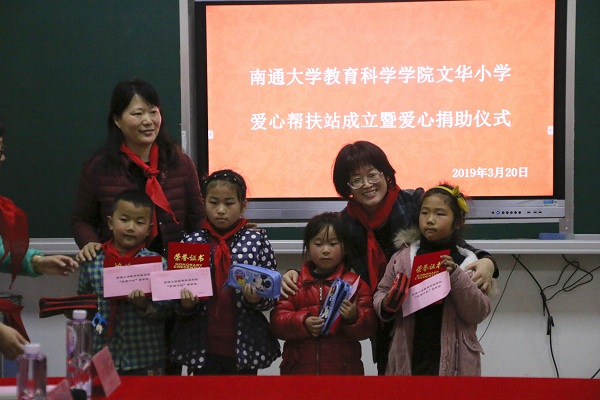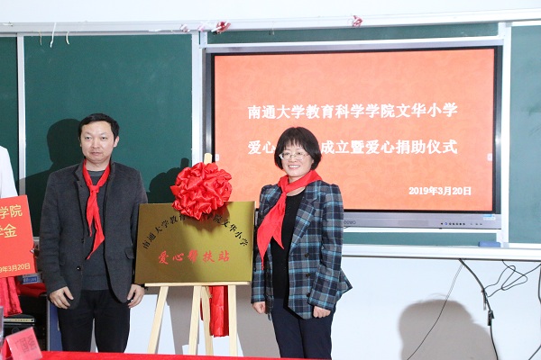 3月20日下午,我院在文华小学设立“扶苗计划”奖学金,并举行了爱心帮扶站揭牌暨图书捐赠仪式。崇川区教育局基础教育科科长蔡娟、文华小学校长丁国强、南通市八一小学校长王海峰、我院党委书记朱丹、党委副书记兼副院长徐红波、团委书记魏琳以及部分志愿者代表和受捐赠学生代表参加了捐赠仪式。
