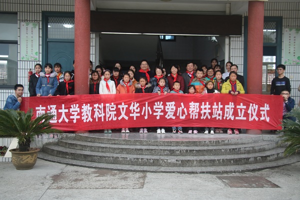 文华小学隶属于二附教育集团,地处南通市观音山镇东北角,系南通市八一小学下属子学校,是名副其实的“村小”,全校293名小学生,均为就近入学的新市民子女。通大教科院的“扶苗计划”公益项目一直以来致力于新市民子女的爱心帮扶,2015年开始志愿者们通过“旧书义卖”的方式筹集善款,此次,与文华小学结成帮扶对子,希望通过助学帮困资助更多的新市民子女。