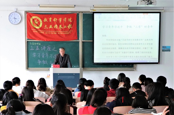 4月17日,6776永利集团在2号楼304举办了以“学习青年习近平,争做三有好青年”为主题的三五讲座,本场讲座由沈玉华老师主讲,教科院150余人到场聆听。