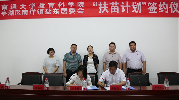 7月28日,我院“扶苗”新市民子女帮扶成长计划团队在院党总支副书记副院长徐红波和副院长沈永江的带领下,赴盐城市亭湖区南洋镇盐东社区,就扶苗计划的拓展签订合作协议,得到亭湖区副区长卫爱军、南洋镇党委书记徐华明、镇长于婷婷等区镇领导的热情接待。