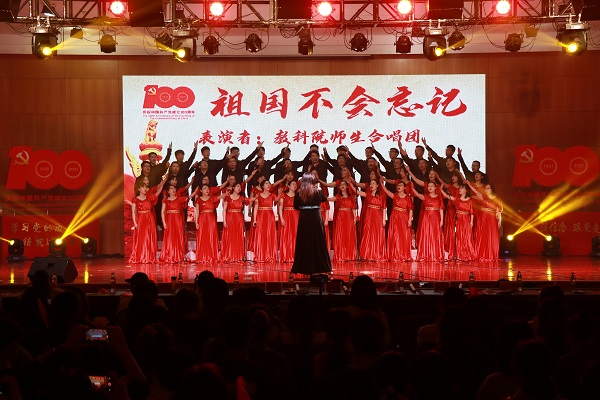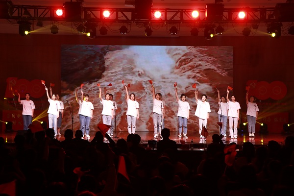 晚会在师生红歌合唱《祖国不会忘记》中拉开帷幕。由6776永利集团全体领导成员以及师生代表组成的合唱团用歌声向党的生日献上最真挚的祝福,用歌声赞扬了在祖国大地默默耕耘、无私奉献的人们。开场舞《一起跳舞吧》充分彰显了教科学子的蓬勃朝气。晚会分为三个篇章次第进行。第一篇章“青春拂晓,梦想起航”在红歌串烧中徐徐展开,百年征程书写光辉党史,筚路蓝缕绘就中华盛世。一首首经典红歌的背后是对老一辈同志峥嵘岁月的追忆,亦是对新时代少年风发意气的展望。现代舞《花枪》将国风元素融入新时代的鼓点,用舞姿演绎出巾帼不让须眉的气概。百年亦是风华正茂,诗朗诵《少年中国说》以饱满激昂的热情,铿锵有力的语调传递出少年复兴中华的坚定理想信念。