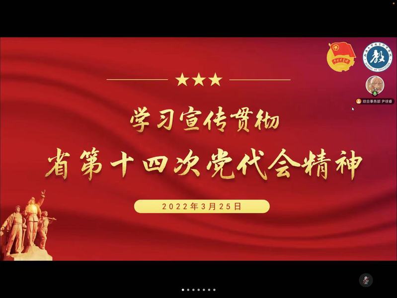 3月25日,我院团委学生会通过腾讯会议顺利召开了省第十四次党代会精神学习会。本次学习会由组织部部长刘一凡主讲,由综合事务部学员尹徐睿主持。教科团学全体学生干部及第三届新生骨干训练营全体学员参加了本次会议。