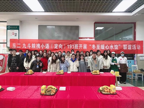 2021年12月21日下午,小教语文(定向)191携手“九斗粮”餐饮公司开展了“冬至暖心水饺”联谊活动。本次活动还邀请到了学院党委书记、小语定向191班主任朱丹老师一同参与。