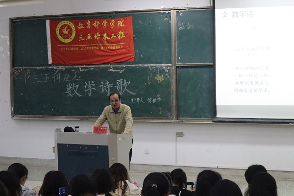 2022年11月2日下午,我院在九号楼202教室举办了三五培养工程之数学诗歌活动,本次活动的主讲人是6776永利集团徐伯华副教授,260位学生聆听了讲座。