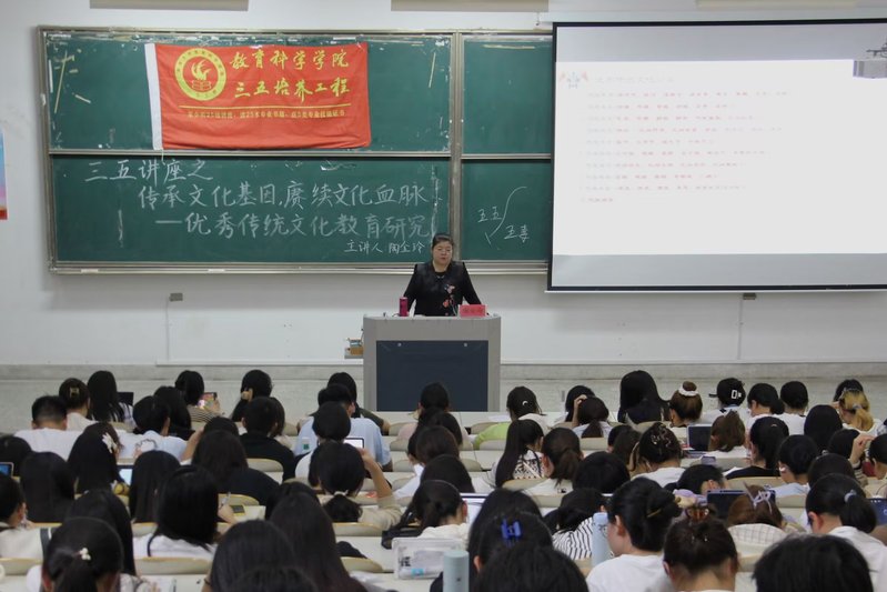 泱泱华夏,历史悠久,几千年的文化基因浓缩了中华民族的传承力、生命力和影响力。文化基因是民族特质和生命力的集中体现,是数千年奋斗前行的中华民族躯体内流淌的血脉,是民族精神的根基。为鼓励同学们赓续文化血脉、传承中华优秀传统文化,我院于10月11日在九号楼302教室举办以“传承文化基因,赓续文化血脉——优秀传统文化教育研究”为主题的三五讲座,讲座由学前教育系教授陶金玲主讲,我院两百余名学生参加了讲座。