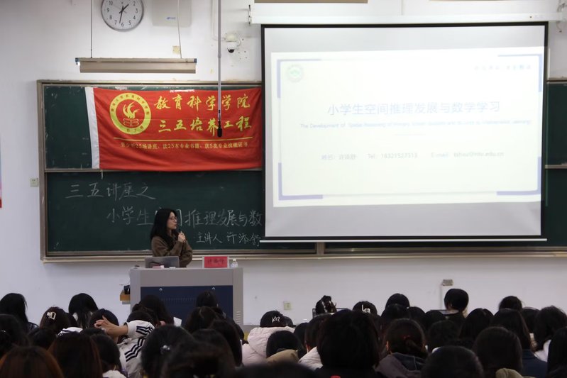 11月22日下午,我院于四号教学楼107室举办以“小学生空间推理发展与数学学习”为主题的三五讲座。讲座由许添舒老师担任主讲人,我院260余名同学参加了本次讲座。