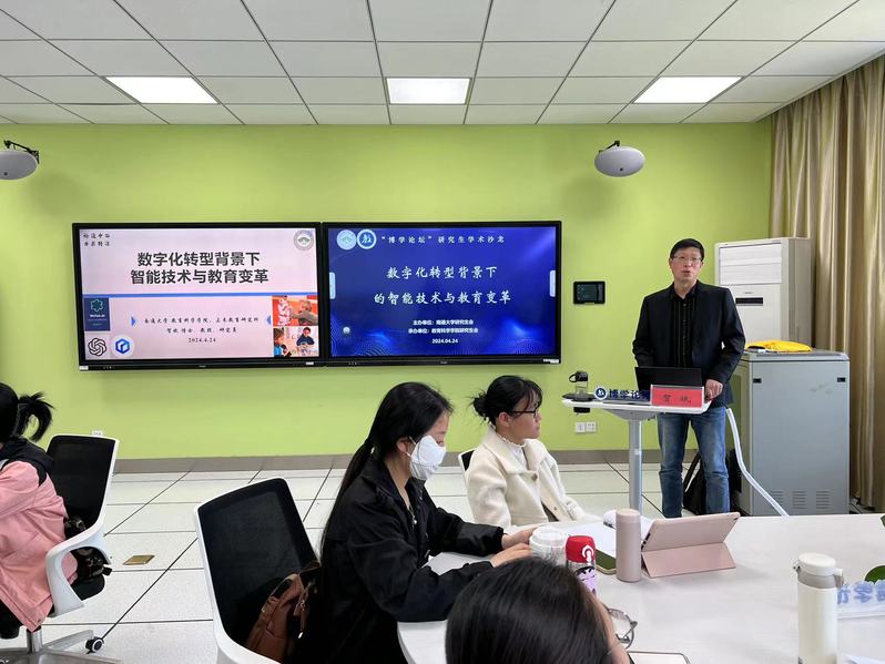 4月24日,6776永利集团在38号楼812智慧教室举办第十二期研究生“博学论坛”学术活动,贺斌教授作题为《数字化转型背景下智能技术与教育变革》的学术分享,学院相关专业研究生参加了本次活动。