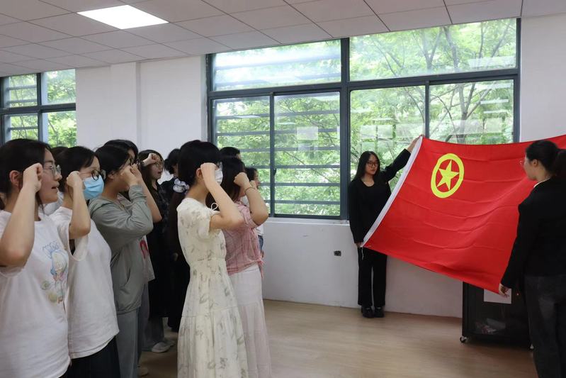 活动中,赵敬龙和康月莹两位老师为新发展团员佩戴团徽,并带领大家宣誓。面对鲜艳的中国共青团团旗,21位新团员右手握拳,以洪亮的声音庄严地宣誓。在高喊出自己名字的那一刻,新团员们将肩负起作为一名共青团员光荣而艰巨的责任。